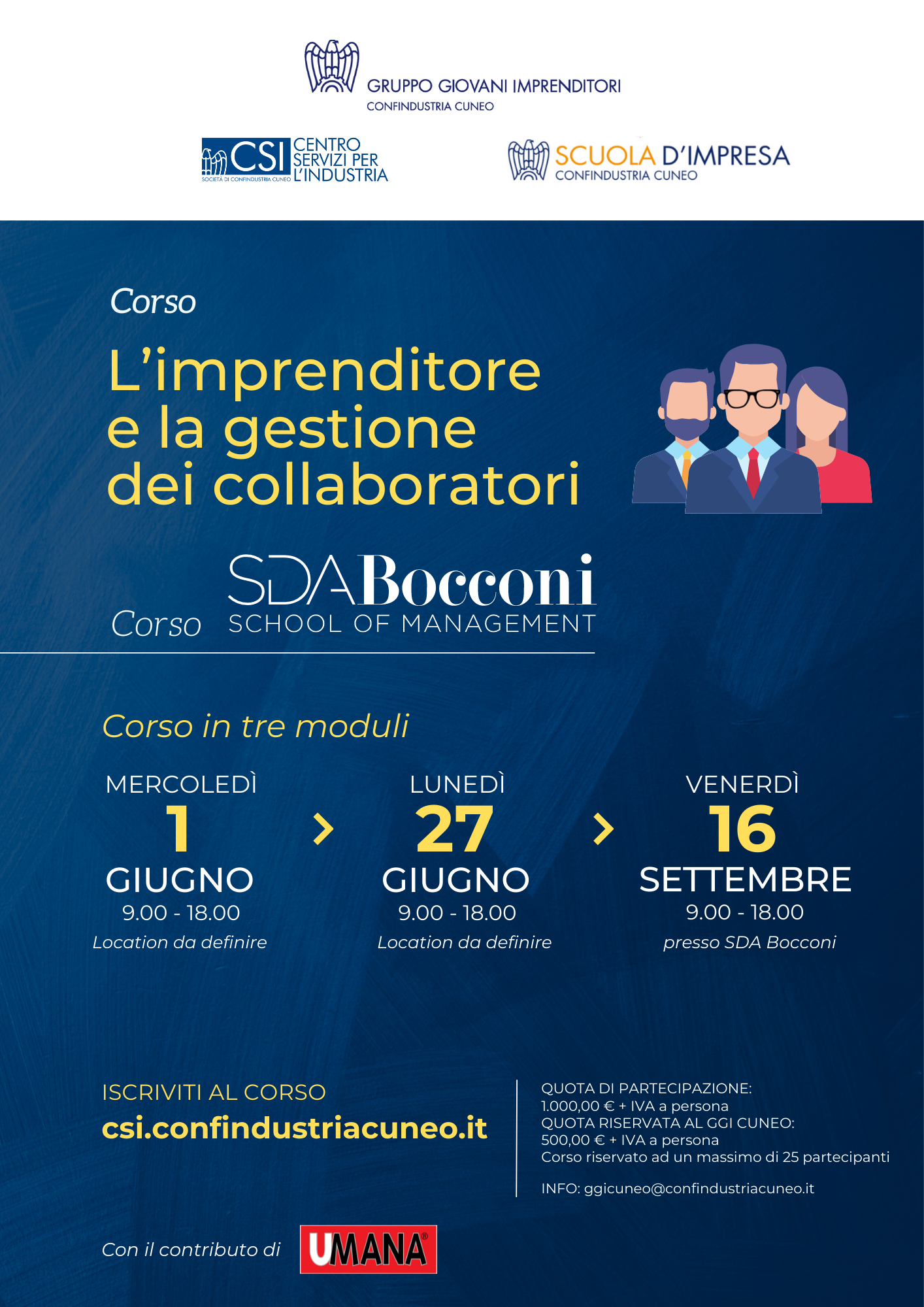 Percorso formativo per gli ISCRITTI GRUPPO GIOVANI IMPRENDITORI CONFINDUSTRIA CUNEO organizzato con SDA BOCCONI con l'obiettivo di trasferire logiche e strumenti per trasformare l’organizzazione e la gestione del personale in una reale fonte di vantaggio competitivo dell’azienda. Il partecipante otterrà gli strumenti utili a strutturare la propria organizzazione aziendale e inserire le risorse nell’organigramma, passare da un’organizzazione personalizzata spesso a misura del fondatore ad una più manageriale, capirà quali strumenti utilizzare e come fare selezione per attrarre i talenti, come valorizzare la carriera e il trasferimento delle competenze dai senior agli junior e come comunicare tra le varie generazioni in azienda